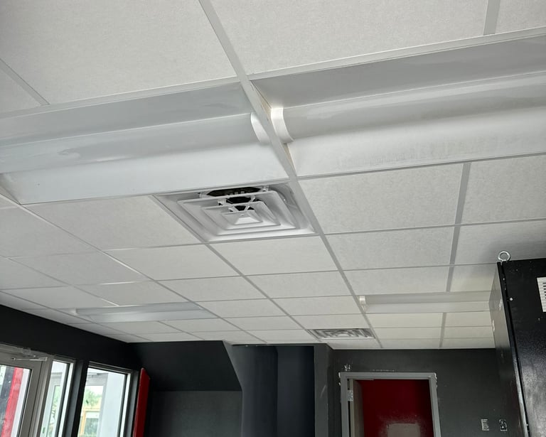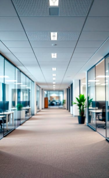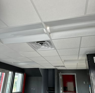 "Our ceiling grid and drop ceiling tile installation systems provides functional and visually appealing solutions for commercial spaces. Designed to conceal wiring, ductwork, and other utilities, drop ceilings offer easy access for maintenance while improving acoustics and lighting. With a range of tile options available, we create customized, professional finishes that enhance the overall aesthetic and functionality of your workspace, delivering both practicality and style."